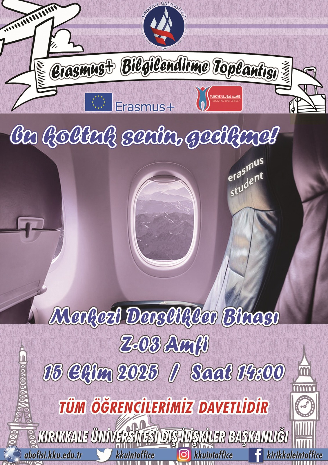 Üniversitemiz öğrencilerine yönelik olarak 15 Ekim 2025 Çarşamba, Saat 14:00 - Merkezi Derslikler Binası Z03 Amfi'de "Erasmus+ Bilgilendirme Toplantısı" gerçekleştirilecek olup tüm öğrencilerimizin katılımı beklenmektedir.
